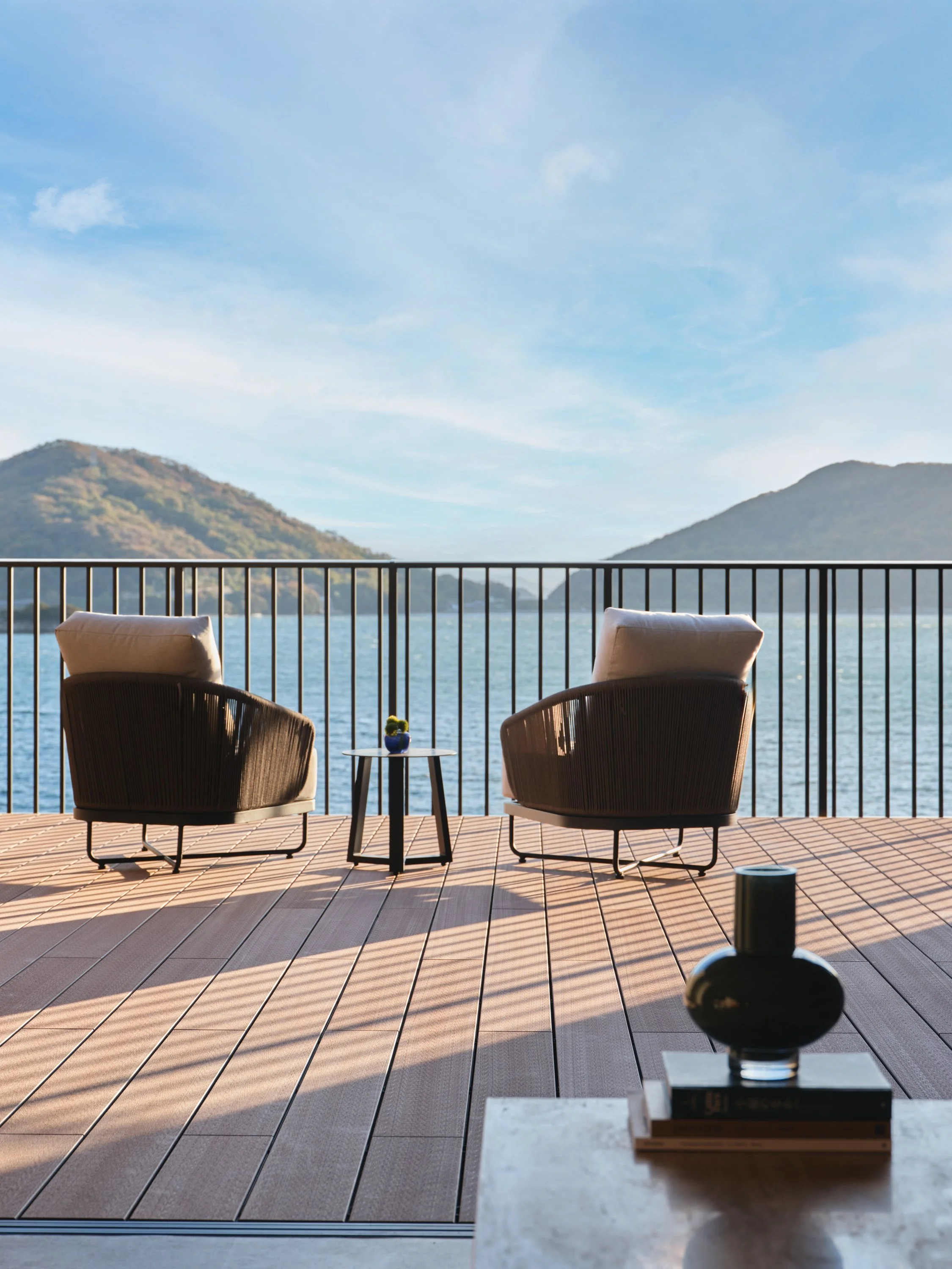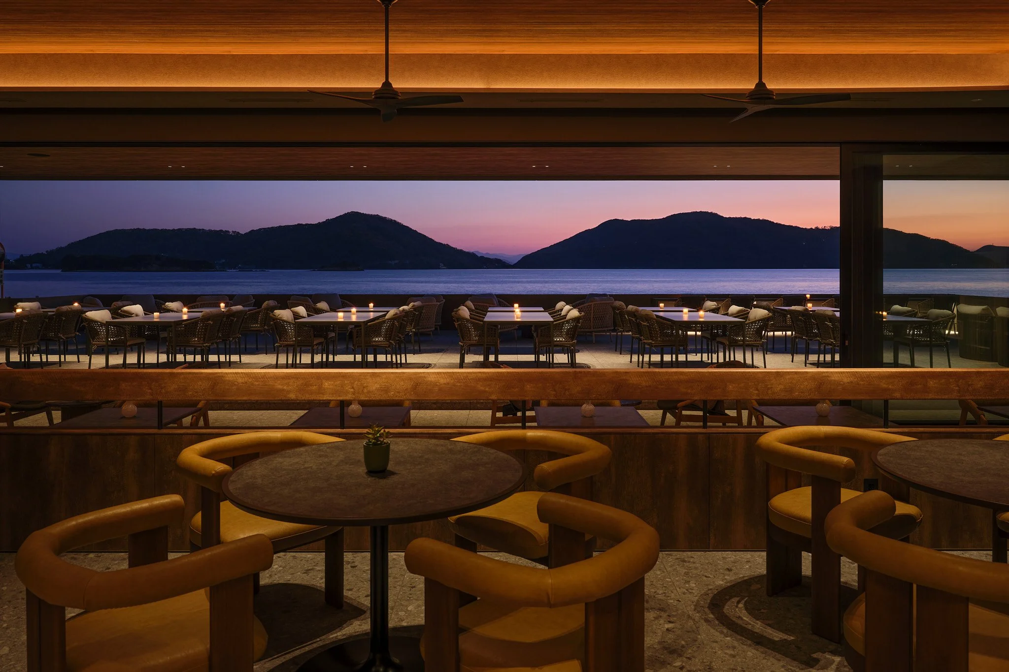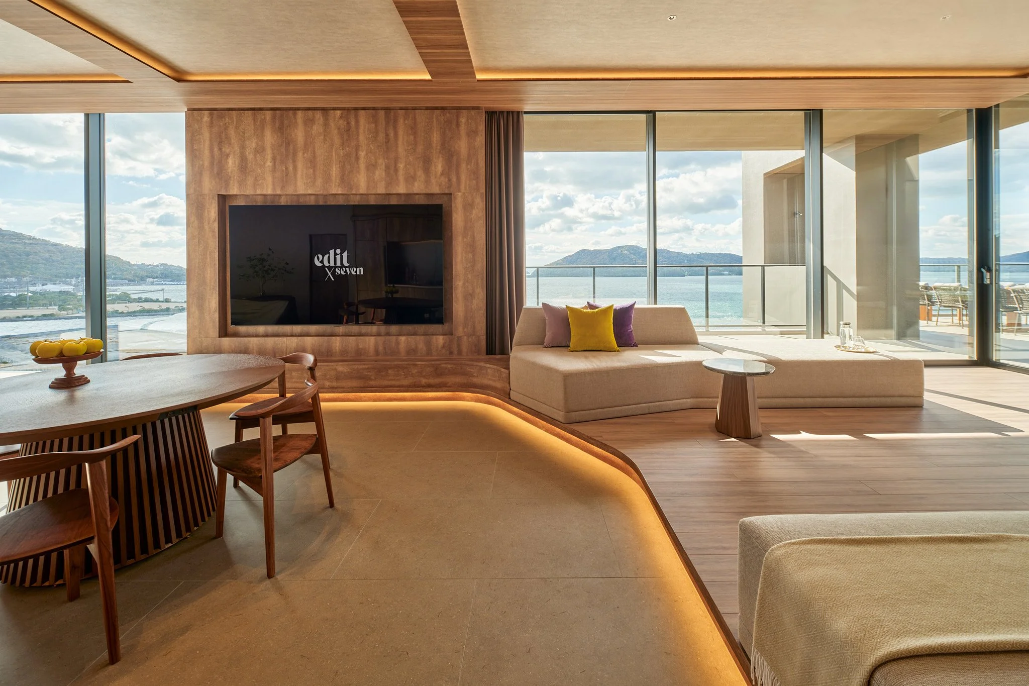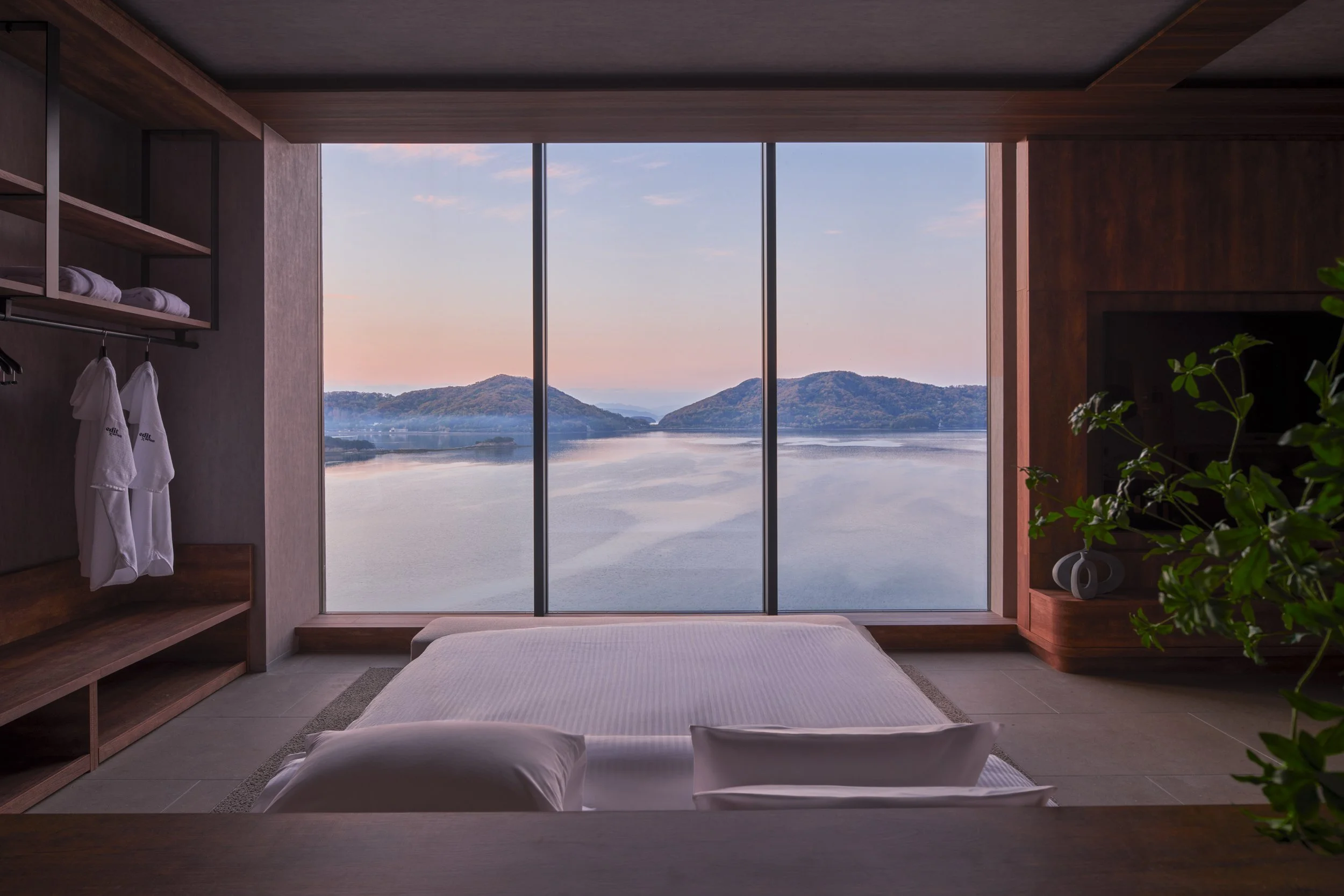 On Shodoshima, the objective was not to frame a singular landmark, but to embed the property within its surroundings. The design shifts toward a more tactile and organic expression using natural materials, warmer tones, and softer transitions between spaces to align with the island’s character.