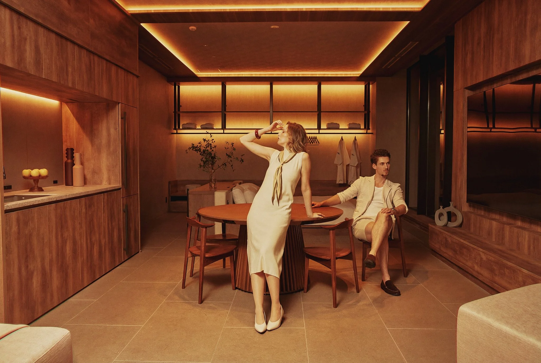 The design language follows the core edit x seven principles: warm minimalism, clean geometry, and material restraint. Interiors are reduced to essential elements, with a focus on natural textures and tonal consistency. This creates an environment that feels calm, grounded, and immediately legible.