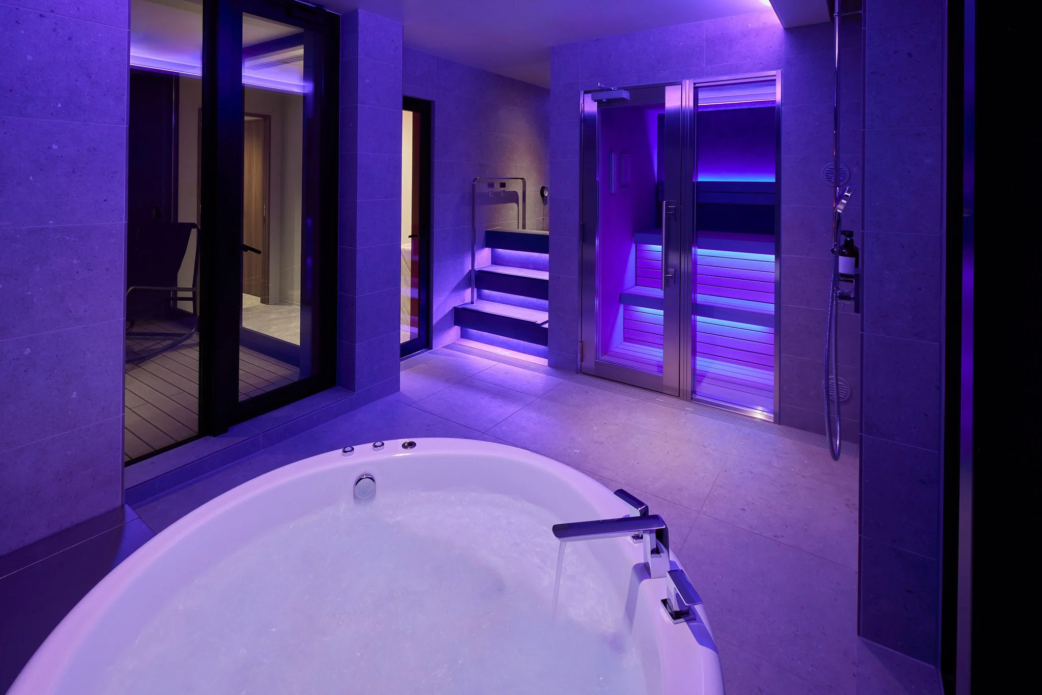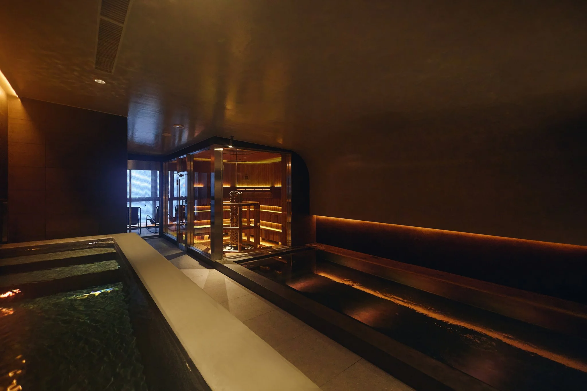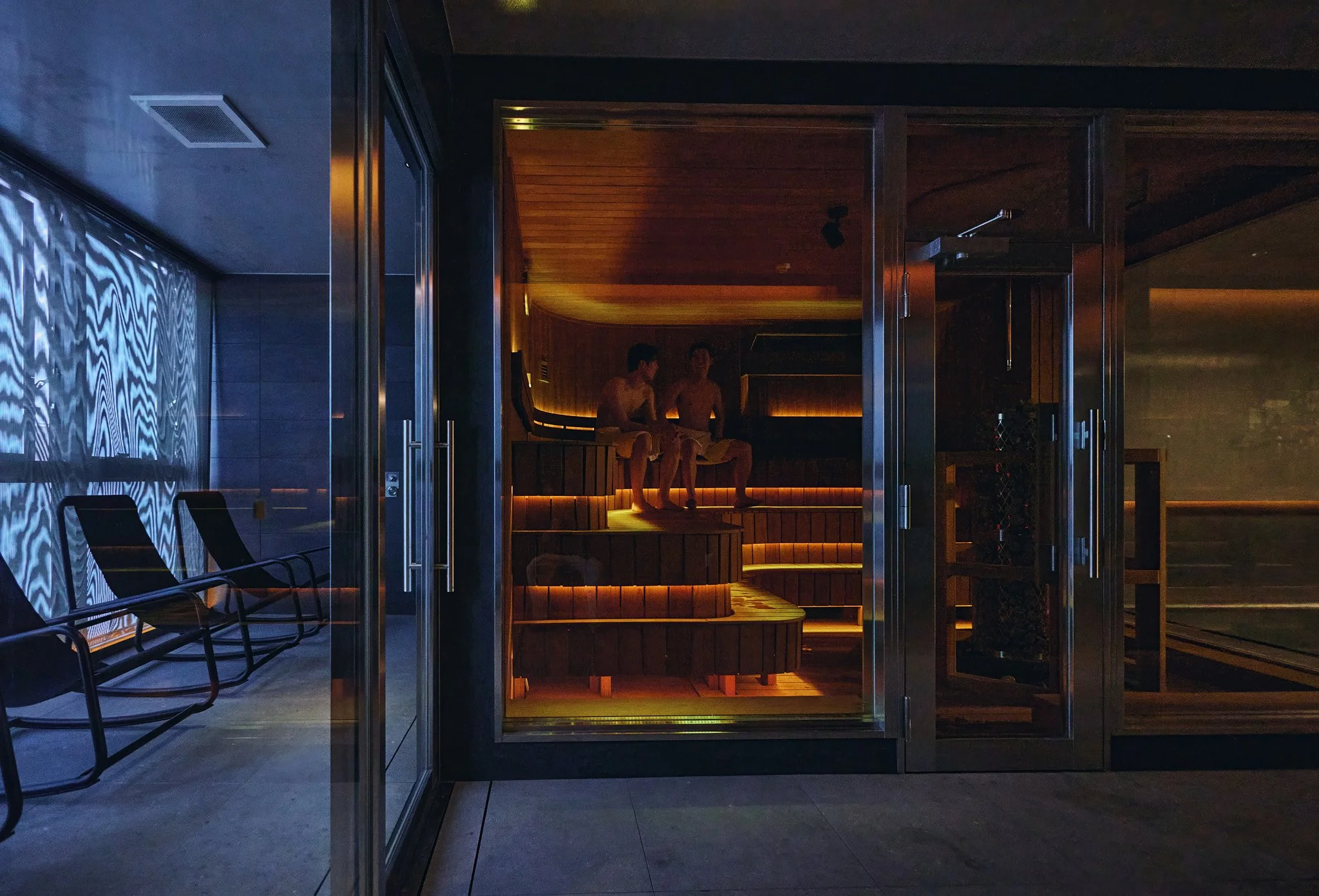 The resort features multiple swimming pools including a family pool and a rooftop infinity pool with sea views, a sauna and cold baths, and a variety of dining options such as the Latin‑Italian inspired restaurant Batida and an underground lounge bar with over 200 types of gin.